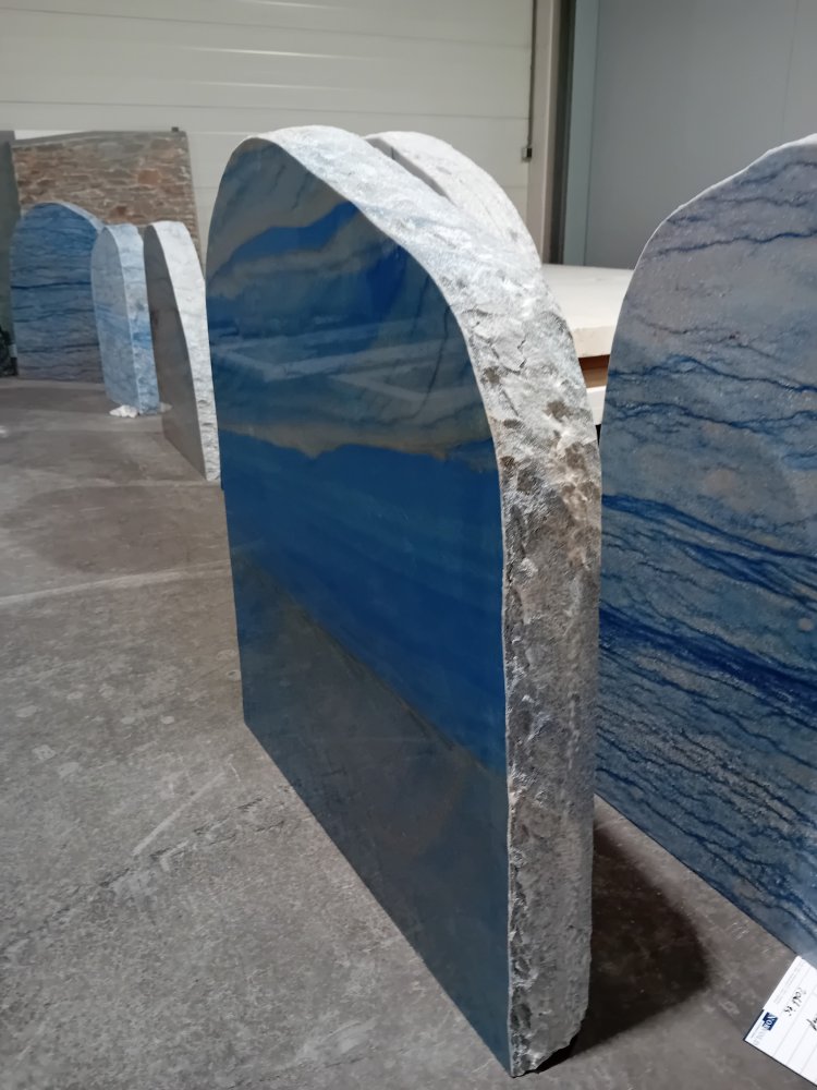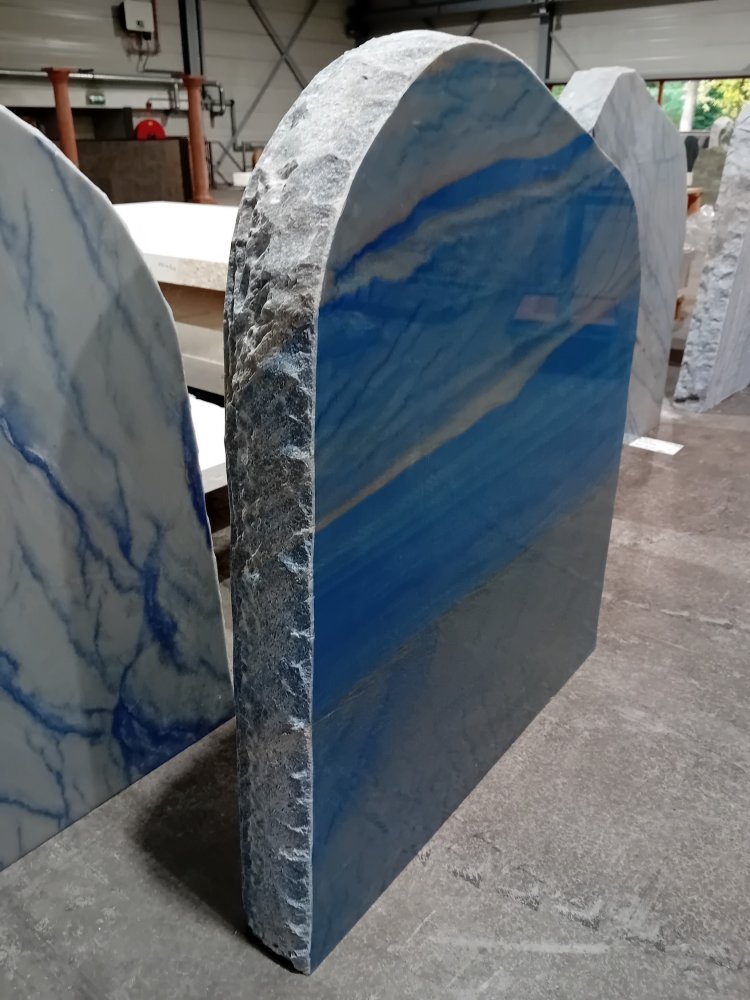 Deze gedenksteen van Azul macauba kwartsiet met een gepolijste voorkant en bekapte zijden word gevonden in Brazilië en heeft een mooie diepe blauw/witte adering. Deze gedenksteen is tevens verkrijgbaar met een gebrande voorzijde.